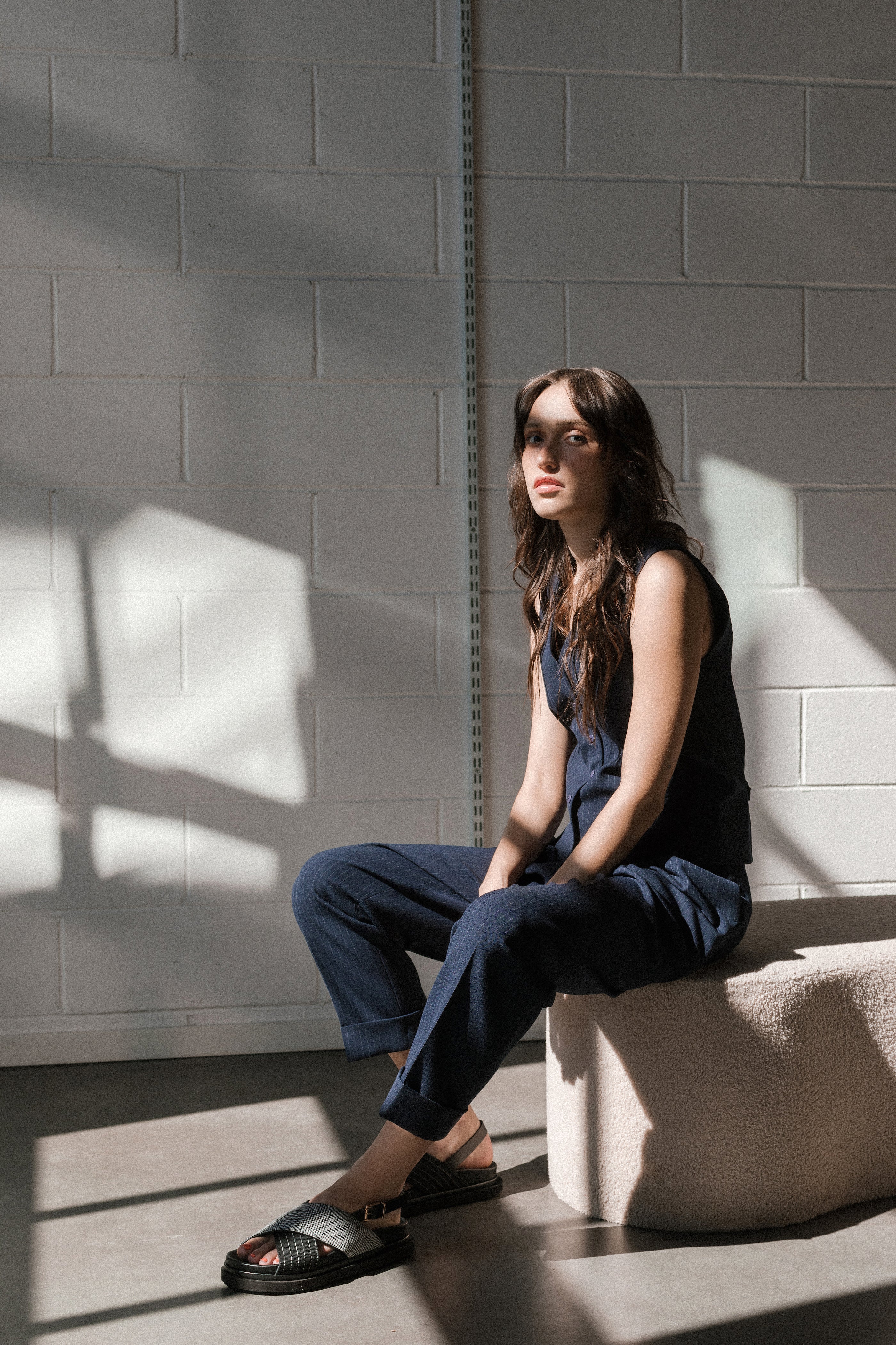 KYRA trousers are cut from dark blue pinstriped strechy fabric and have straight leg with tapered cuffs and front pleats. Proven to be most comfortable pair of pants in KÄTs collections through out the years. KYRA trousers are classic, versatile and effortless that can be combined into every possible outfit. Pair with classic white shirt to have an office-lunch ready outfit or wear with sweatshirt and trainers to have a casual everyday look. For a Peaky Blinders look, go for the full set with Remi vest.