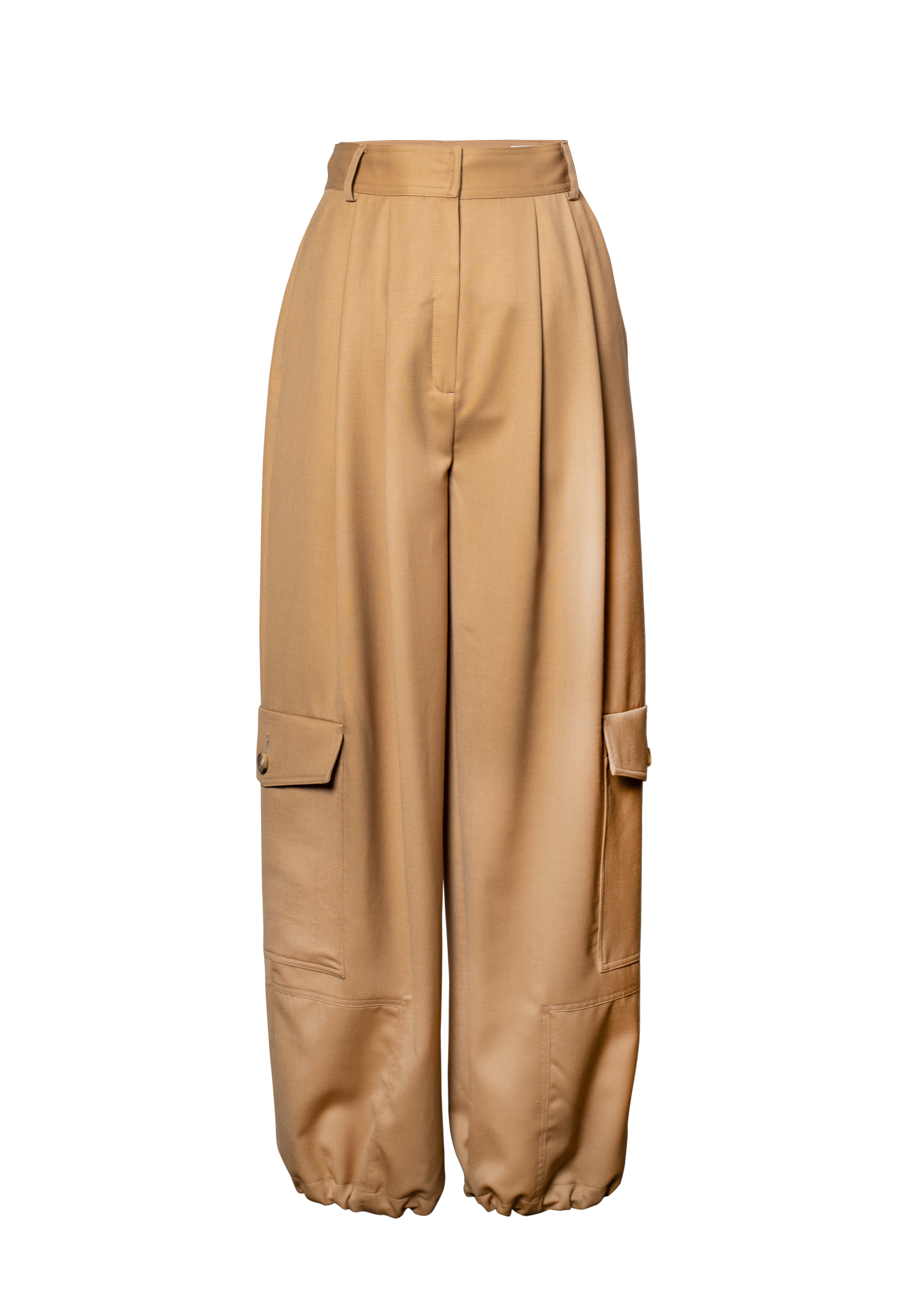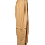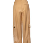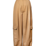TARA pants that are designed with a relaxed, wide-leg fit and an adjustable waist offering both comfort and a cool, casual vibe. The oversized patch pockets add utility and character to the soft camel-colored appearance. Perfect for laid-back days or casual outings!