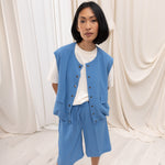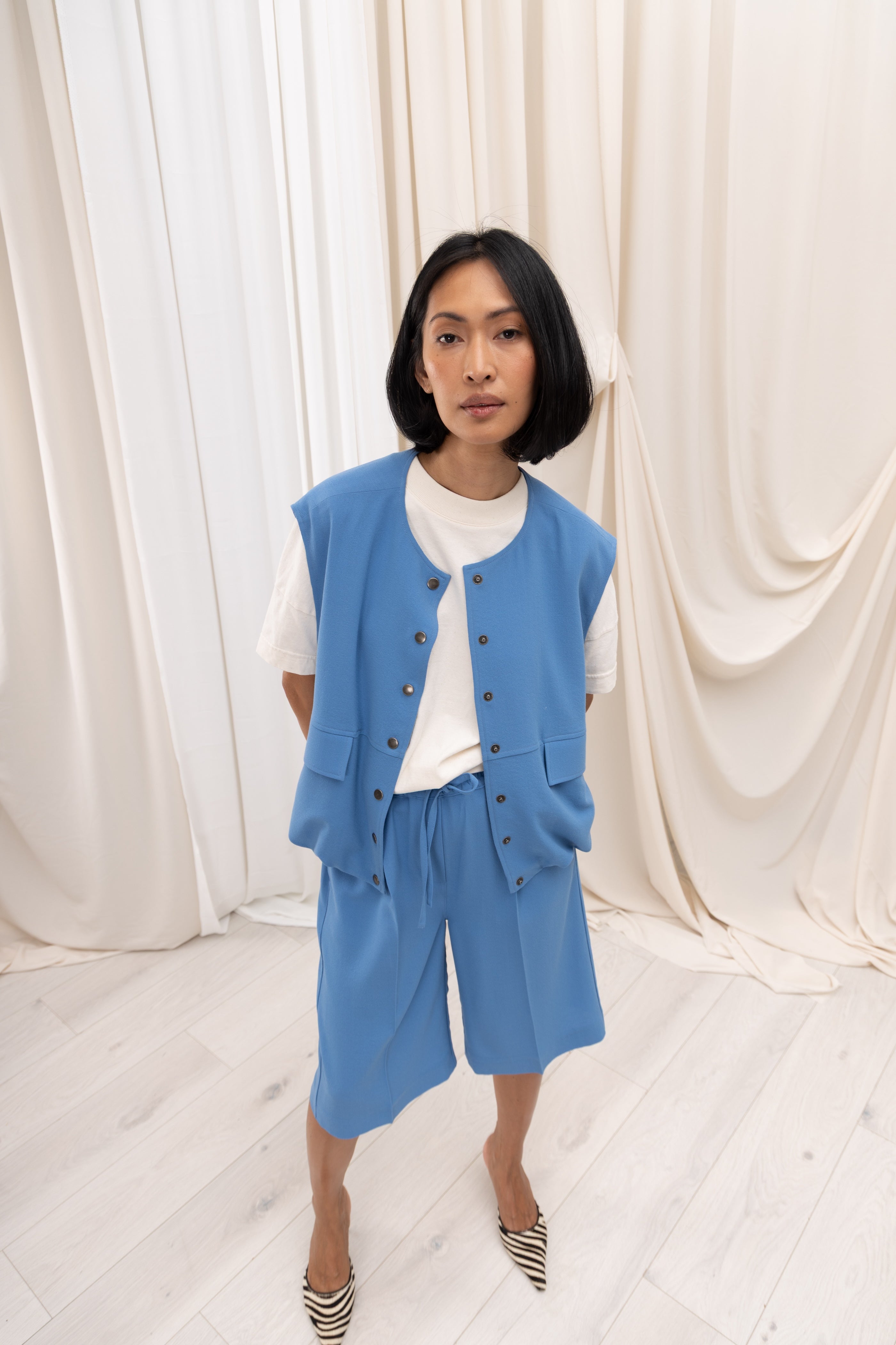 Tailored but totally relaxed, the Chloet Shorts are cut from a crisp crepe wool in electric blue. Designed with a soft elastic waistband, adjustable tie, and sharp pleats, they strike the perfect balance between ease and structure. Effortless with a tank, polished with the matching Nicole Wool Vest.